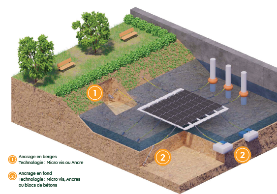 Ces îlots sont ancrés soit sur les berges, soit au fond du plan d’eau à l’aide d’ancres ou de pieux. L’énergie captée par les panneaux solaires est ensuite acheminée et convertie avant d’être transmise par un réseau de câbles à un transformateur, qui adapte la tension au niveau requis pour l’injection dans le réseau électrique.